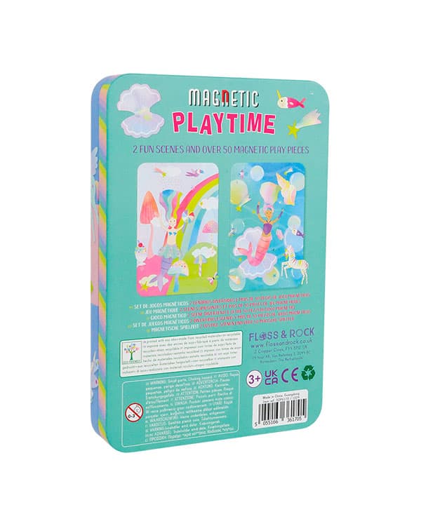 Magnetic playtime από την αγγλική εταιρεία Floss & Rock. Διασκεδαστικό παιχνίδι σε ένα εύχρηστο μαγνητικό κουτί! Περιέχει 3 φύλλα με μαγνήτες που βγαίνουν για να διασκεδάσετε κολλώντας πάνω από 50 διασκεδαστικά μαγνητικά κομμάτια στις 2 σκηνές στο εσωτερικό του κουτιού σας και αφήστε τη φαντασία σας ελεύθερη δημιουργώντας υπέροχες εικόνες. Ένα τέλειο παιχνίδι, τυπωμένο με μελάνια σόγιας και κατασκευασμένο από ανακυκλωμένα υλικά. Όταν τελειώσετε το παιχνίδι, το μαγνητικό κουτί αποθηκεύει με ασφάλεια όλα τα κομμάτια σας.