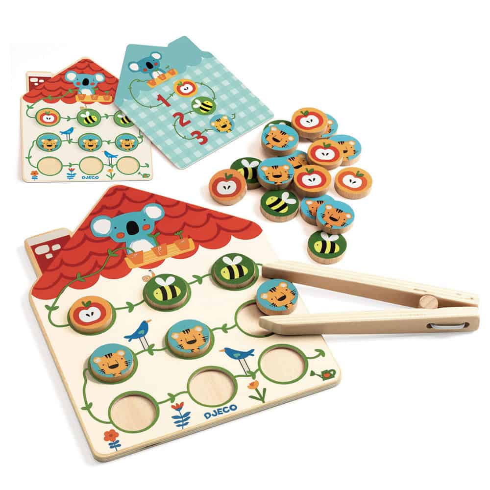 Εκπαιδευτικό παιχνίδι αρίθμησης και επιδεξιότητας από την εταιρεία Djeco. Το παιδί σηκώνει μια κάρτα και βλέπει τις οδηγίες του κοάλα προκειμένου να τοποθετήσει τον σωστό αριθμό αντικειμένων στο ταμπλό – σπιτάκι. Η ορθή απάντηση βρίσκεται στο πίσω μέρος κάθε κάρτας. Η λαβίδα είναι ένα εξαιρετικό μέσο εξάσκησης της λεπτής κινητικότητας.